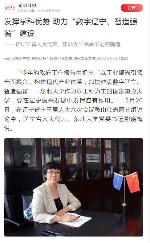 “今年的政府工作报告中提出‘以工业振兴引领全面振兴,构建现代产业体系,加快建设数字辽宁、智造强省’,东北大学作为以工科为主的国家重点大学,要在辽宁振兴发展中发挥应有作用。” 1月20日,在辽宁省十三届人大六次会议鞍山代表团分组讨论中,辽宁省人大代表、东北大学党委书记熊晓梅说。