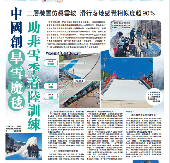 香港文匯報訊(記者 于珈琳 瀋陽報道)冬奧會上,自由式滑雪項目中運動員的穩穩着陸總是能讓觀眾懸着的心也穩穩放下,因為着陸成敗直接反映出整套動作的成敗。這穩穩一站,來自運動員千百次的刻苦訓練,而如何用科技力量幫助他們不負艱辛付出,正是「變剛度複合結構着陸坡」研發設計團隊帶頭人、東北大學力學系主任李東教授近一年來努力的方向。由他帶隊的科研攻關小組研發的這套裝置乃世界首座旱雪着陸坡,被中國冬奧健兒喻為「旱雪魔毯」,已於2021年7月在河北淶源國家跳台滑雪訓練科研基地投用,自由式滑雪空中技巧、跳台滑雪等國家隊的夏季訓練和熱身賽就是在這裏完成的。
