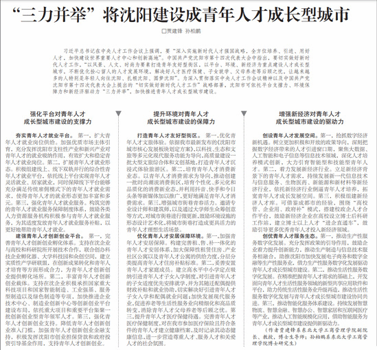 习近平总书记在中央人才工作会议上强调,要“深入实施新时代人才强国战略,全方位培养、引进、用好人才,加快建设世界重要人才中心和创新高地”。中国共产党沈阳市第十四次代表大会中指出,要切实做好新时代人才工作,“以风景、人文、时尚为要素打造青年友好型街区,以平台、环境、新经济为重点建设人才成长型城市,不断优化拴心留人的人才发展环境,解决好人才医疗保健、子女就学、父母养老等后顾之忧,让越来越多的人特别是年轻人向往沈阳、扎根沈阳、圆梦沈阳”。为深入贯彻落实中央人才工作会议精神以及中国共产党沈阳市第十四次代表大会上提出的“切实做好新时代人才工作”战略部署,沈阳市可依托平台支撑力、环境保障力和新经济驱动力“三力并举”,加快推进青年人才成长型城市建设。