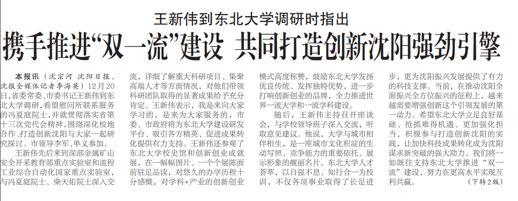 本报讯(沈宗河 沈阳日报、沈报全媒体记者李海英)12月20日,省委常委、市委书记王新伟到东北大学调研,看望慰问所联系服务的冯夏庭院士,并就贯彻落实省第十三次党代会精神,围绕深化校地合作、打造创新沈阳与大家一起研究探讨。市领导李军、单义参加。