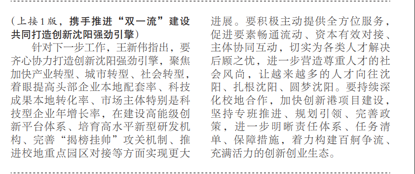 针对下一步工作,王新伟指出,要齐心协力打造创新沈阳强劲引擎,聚焦加快产业转型、城市转型、社会转型,着眼提高头部企业本地配套率、科技成果本地转化率、市场主体特别是科技型企业年增长率,在建设高能级创新平台体系、培育高水平新型研发机构、完善“揭榜挂帅”攻关机制、推进校地重点园区对接等方面实现更大进展。要积极主动提供全方位服务,促进要素畅通流动、资本有效对接、主体协同互动,切实为各类人才解决后顾之忧,进一步营造尊重人才的社会风尚,让越来越多的人才向往沈阳、扎根沈阳、圆梦沈阳。要持续深化校地合作,加快创新港项目建设,坚持专班推进、规划引领、完善政策,进一步明晰责任体系、任务清单、保障措施,着力构建百舸争流、充满活力的创新创业生态。