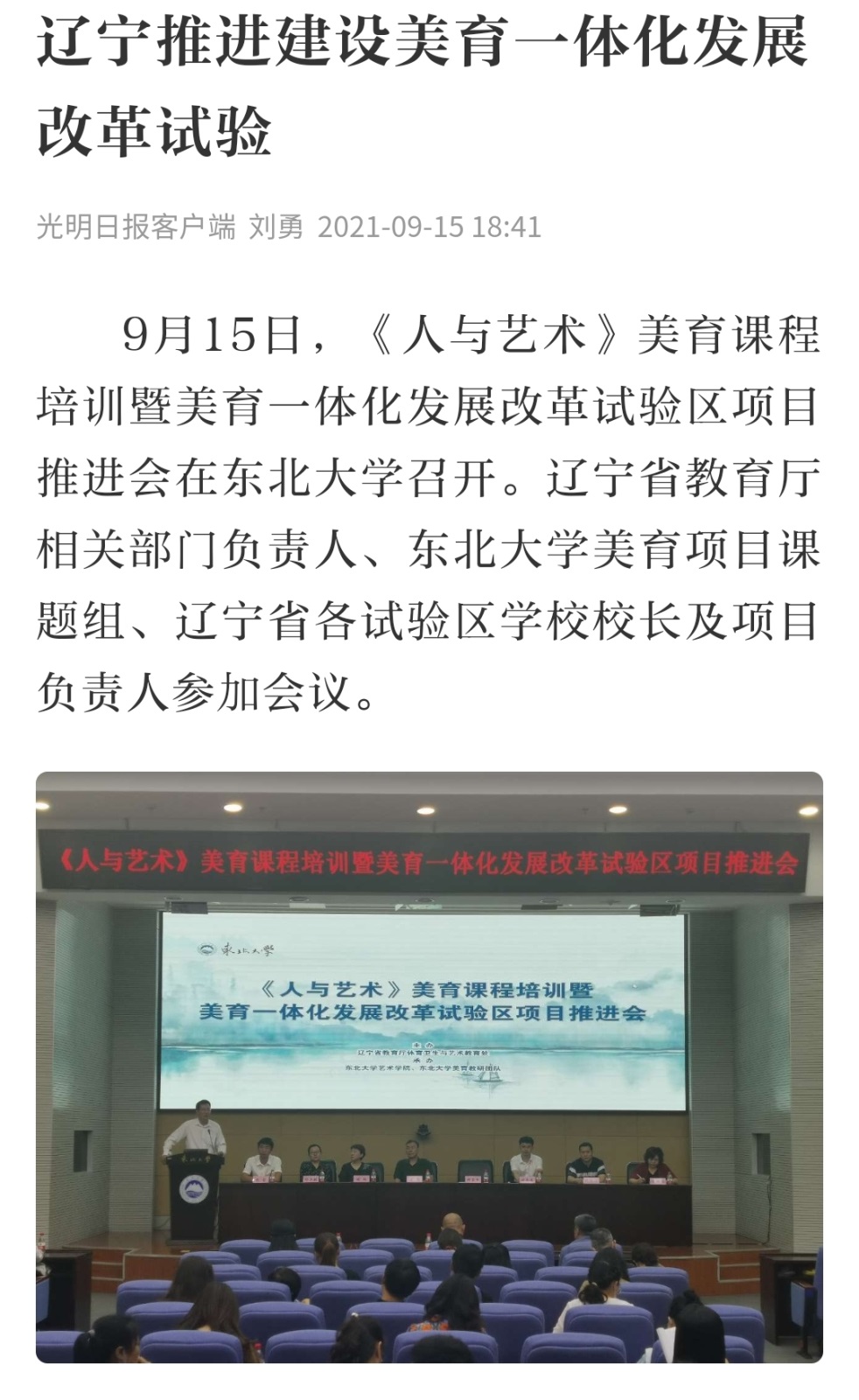 9月15日,《人与艺术》美育课程培训暨美育一体化发展改革试验区项目推进会在东北大学召开。辽宁省教育厅相关部门负责人、东北大学美育项目课题组、辽宁省各试验区学校校长及项目负责人参加会议。