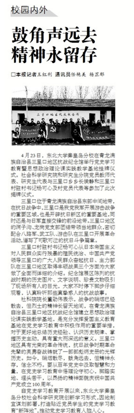 4月23日,东北大学秦皇岛分校在青龙满族自治县三星口地区抗战纪念馆举行党史学习教育暨思想政治理论课实践教学基地挂牌仪式。社会科学研究院和研究生分院党员教师代表、研究生代表与三星口乡乡长侯静和三星口村驻村书记杨可心及村党员代表等参加了此次揭牌仪式。