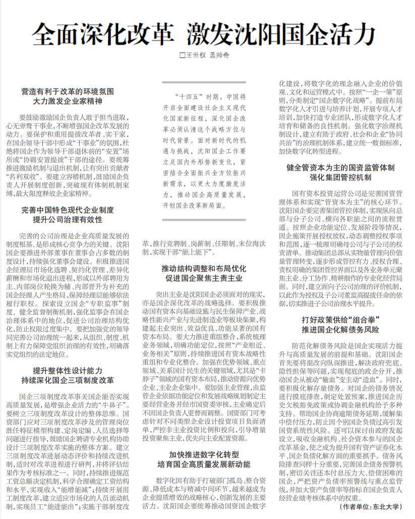 “十四五”时期,中国将开启全面建设社会主义现代化国家新征程,深化国企改革必须认清这个战略方位与时代背景。面对新时代的机遇与挑战,沈阳国企工作要立足国内外形势新变化,紧密结合全面振兴全方位振兴新需求,以更大力度激发活力,推动国企高质量发展,开创国企改革新局面。