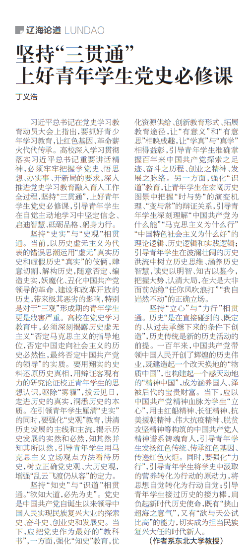 习近平总书记在党史学习教育动员大会上指出,要抓好青少年学习教育,让红色基因、革命薪火代代传承。高校深入学习贯彻落实习近平总书记重要讲话精神,必须牢牢把握学党史、悟思想、办实事、开新局的要求,深入推进党史学习教育融入育人工作全过程,坚持“三贯通”,上好青年学生党史必修课,引导青年学生在自觉主动地学习中坚定信念、启迪智慧、砥砺品格、躬身力行。