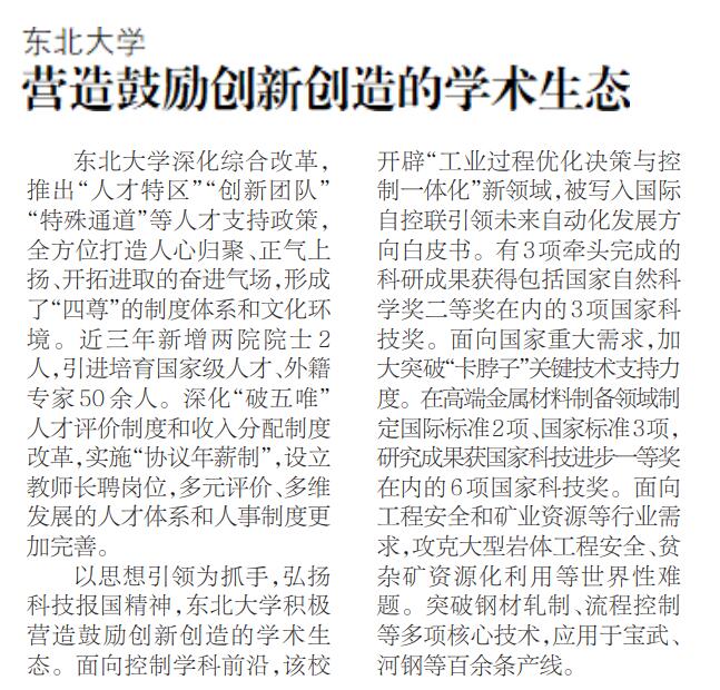 以思想引领为抓手,弘扬科技报国精神,东北大学积极营造鼓励创新创造的学术生态。面向控制学科前沿,该校开辟“工业过程优化决策与控制一体化”新领域,被写入国际自控联引领未来自动化发展方向白皮书。有3项牵头完成的科研成果获得包括国家自然科学奖二等奖在内的3项国家科技奖。面向国家重大需求,加大突破“卡脖子”关键技术支持力度。在高端金属材料制备领域制定国际标准2项、国家标准3项,研究成果获国家科技进步一等奖在内的6项国家科技奖。面向工程安全和矿业资源等行业需求,攻克大型岩体工程安全、贫杂矿资源化利用等世界性难题。突破钢材轧制、流程控制等多项核心技术,应用于宝武、河钢等百余条产线。