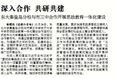 本报讯(记者孙雪梅)12月28日,东北大学秦皇岛分校与市第三中学关于大学中学思想政治教育一体化建设合作签约仪式在东北大学秦皇岛分校举行。双方签订合作意向书,将通过搭建思政教育研究平台,加强教师之间的交流,互通体会心得,定期开展学术交流活动,在课堂教学、课题研究、教材开发、成果推广等领域广泛开展合作。
