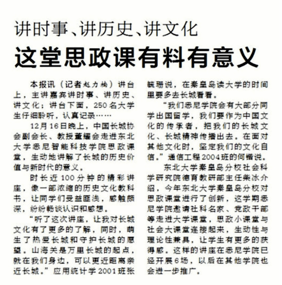 12月16日晚上,中国长城协会副会长、教授董耀会走进东北大学悉尼智能科技学院思政课堂,生动地讲解了长城的历史价值与新时代的意义。