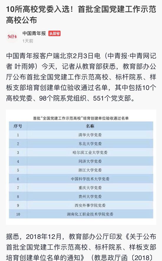 中国青年报客户端北京2月3日电(中青报·中青网记者 叶雨婷)今天,记者从教育部获悉,教育部办公厅公布首批全国党建工作示范高校、标杆院系、样板支部培育创建单位验收通过名单,其中包括10个高校党委、98个院系党组织、551个党支部。