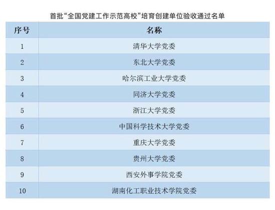 据悉,2018年12月,教育部办公厅印发《关于公布首批全国党建工作示范高校、标杆院系、样板支部培育创建单位名单的通知》(教思政厅函〔2018〕43号),确定10个高校党委、100个院系党组织、559个党支部作为全国党建工作示范高校、标杆院系、样板支部培育创建单位。两年建设期内,各单位按照教育部明确的创建工作要求,坚持统筹规划和分步实施相结合、整体提升和品牌塑造相结合、软件建设和硬件建设相结合,扎实开展培育创建工作,大部分单位按期完成建设任务,有效带动高校党建工作质量整体提升。