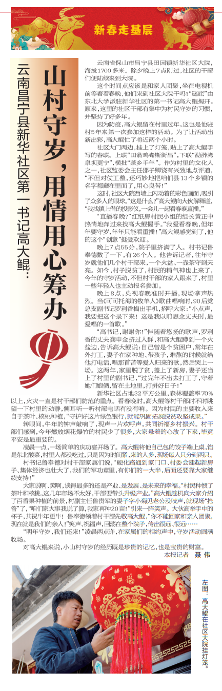 新华社区占地32平方公里,森林覆盖率70%以上,火灾一直是村干部们防范的重点。看春晚时,高大鲲等村干部时不时眺望一下村里的动静,侧耳听一听村部电话有没有响。因为村民的主要收入来自于茶叶、核桃种植,“守护好这片绿色银行,就能巩固拓展脱贫攻坚成果。”