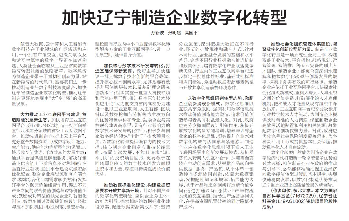 随着大数据、云计算和人工智能等数字科技在工业领域的广泛渗透和应用,一个拥有广维交互、边缘关联以及和谐互生属性的数字世界正在加速构建,人类社会面临着从工业经济向数字经济转型过渡的战略变革。数字经济为制造企业带来了重构性创新力量,站在新经济的时代风口,需要我们进一步推动制造业与数字科技深度融合,加快辽宁省制造企业数字化转型,推动辽宁制造更好地实现由“大”变“强”的高质量发展。