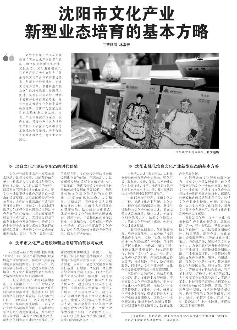 党的十九届五中全会明确提出“实施文化产业数字化战略,加快发展新型文化企业、文化业态、文化消费模式”。这是承应党的十九大报告“健全现代文化产业体系和市场体系,创新生产经营机制,完善文化经济政策,培育新型文化业态”的战略规划,是满足人民过上美好生活新期待、提供丰富精神食粮的现实要求,是科技发展推动文化创新发展的必然逻辑。沈阳作为国家历史文化名城和老工业基地,文化、产业和科技积淀深厚,促进文化、科技和产业融合以培育文化产业新型业态是推动老工业基地全面振兴、全方位振兴的重要推动力,意义重大而深远。