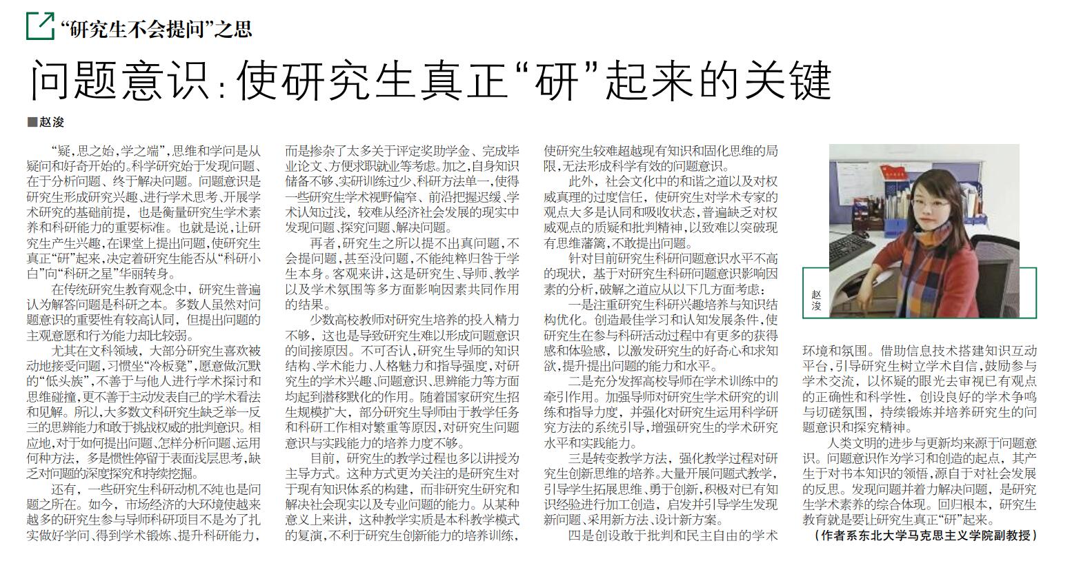 人类文明的进步与更新均来源于问题意识。问题意识作为学习和创造的起点,其产生于对书本知识的领悟,源自于对社会发展的反思。发现问题并着力解决问题,是研究生学术素养的综合体现。回归根本,研究生教育就是要让研究生真正“研”起来。