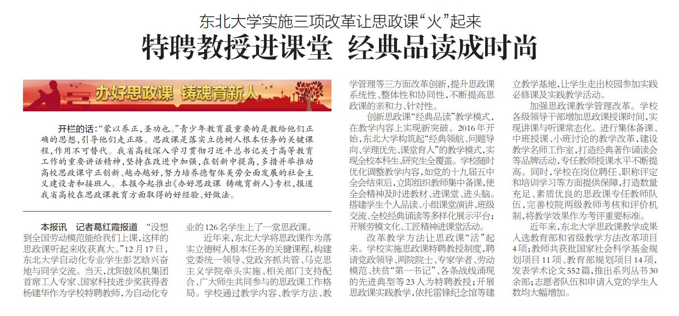 近年来,东北大学将思政课作为落实立德树人根本任务的关键课程,构建党委统一领导、党政齐抓共管、马克思主义学院牵头实施、相关部门支持配合、广大师生共同参与的思政课工作格局。学校通过教学内容、教学方法、教学管理等三方面改革创新,提升思政课系统性、整体性和协同性,不断提高思政课的亲和力、针对性。