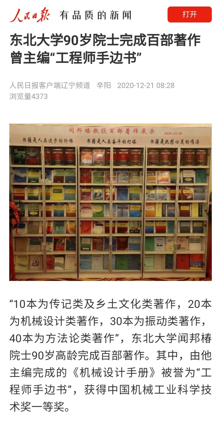 “10本为传记类及乡土文化类著作,20本为机械设计类著作,30本为振动类著作,40本为方法论类著作”,东北大学闻邦椿院士90岁高龄完成百部著作。其中,由他主编完成的《机械设计手册》被誉为“工程师手边书”,获得中国机械工业科学技术奖一等奖。