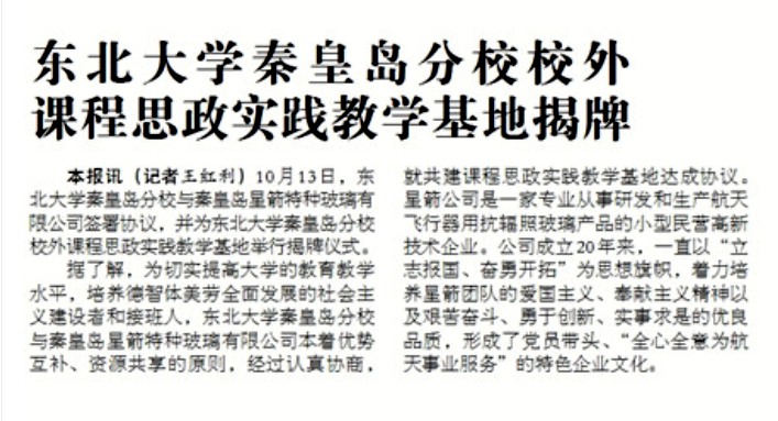 本报讯(记者王红利)10月13日,东北大学秦皇岛分校与秦皇岛星箭特种玻璃有限公司签署协议,并为东北大学秦皇岛分校校外课程思政实践教学基地举行揭牌仪式。