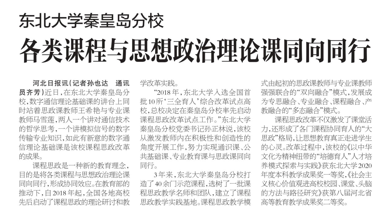 “2018年,东北大学入选全国首批10所‘三全育人’综合改革试点高校,总校决定在秦皇岛分校率先启动课程思政改革试点工作。”东北大学秦皇岛分校党委书记孙正林说,该校从激发教师内在积极性和创造性的角度开展工作,努力实现通识课、公共基础课、专业教育课与思政课同向同行。
