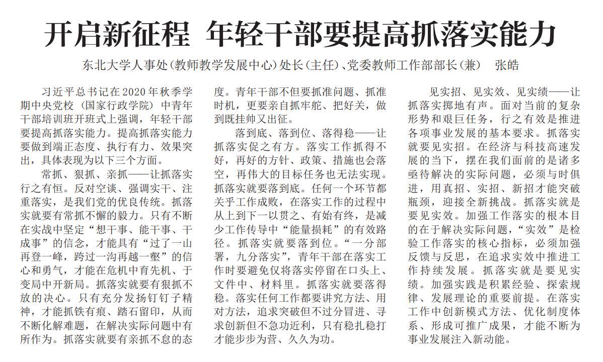 常抓、狠抓、亲抓——让抓落实行之有恒。反对空谈、强调实干、注重落实,是我们党的优良传统。抓落实就要有常抓不懈的毅力。只有不断在实战中坚定“想干事、能干事、干成事”的信念,才能具有“过了一山再登一峰,跨过一沟再越一壑”的信心和勇气,才能在危机中育先机、于变局中开新局。抓落实就要有狠抓不放的决心。只有充分发扬钉钉子精神,才能抓铁有痕、踏石留印,从而不断化解难题,在解决实际问题中有所作为。抓落实就要有亲抓不怠的态度。青年干部不但要抓准问题、抓准时机,更要亲自抓牢舵、把好关,做到既挂帅又出征。