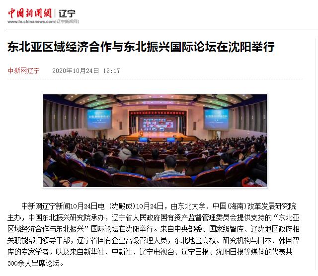 中新网辽宁新闻10月24日电 (沈殿成)10月24日,由东北大学、中国(海南)改革发展研究院主办,中国东北振兴研究院承办,辽宁省人民政府国有资产监督管理委员会提供支持的“东北亚区域经济合作与东北振兴”国际论坛在沈阳举行。来自中央部委、国家级智库、辽沈地区政府相关职能部门领导干部,辽宁省国有企业高级管理人员,东北地区高校、研究机构与日本、韩国智库的专家学者,以及来自新华社、中新社、辽宁电视台、辽宁日报、沈阳日报等媒体的代表共300余人出席论坛。