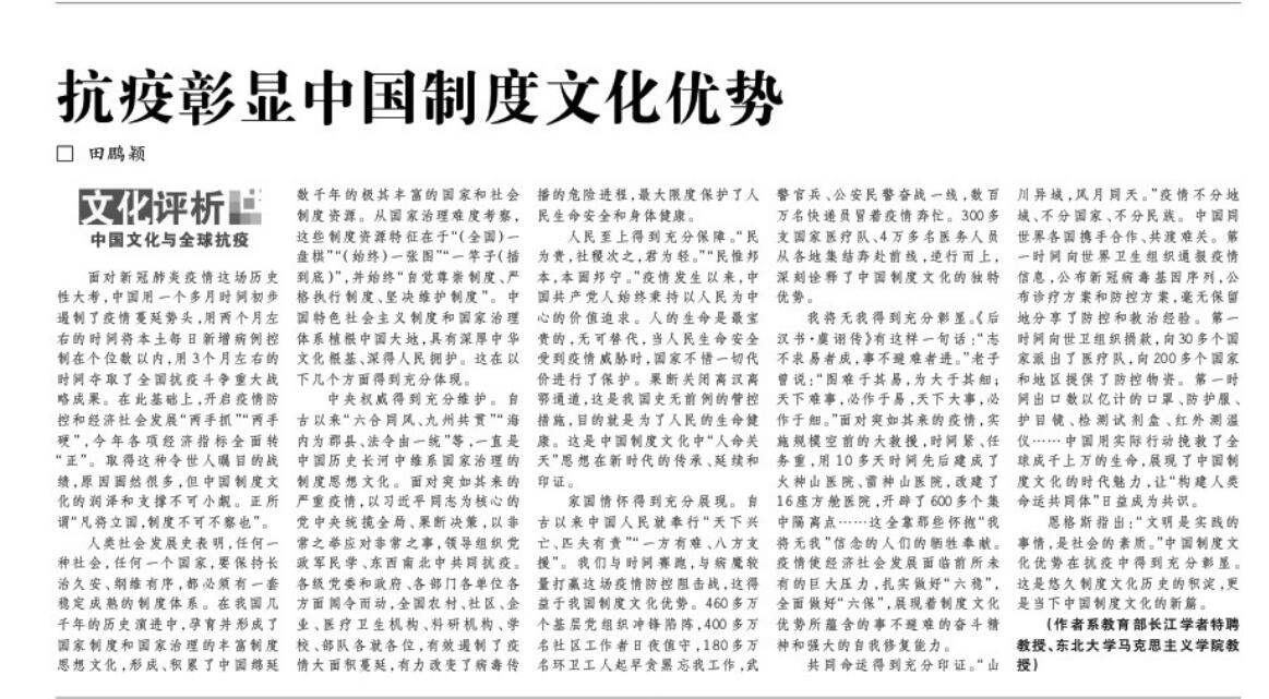 恩格斯指出:“文明是实践的事情,是社会的素质。”中国制度文化优势在抗疫中得到充分彰显。这是悠久制度文化历史的积淀,更是当下中国制度文化的新篇。