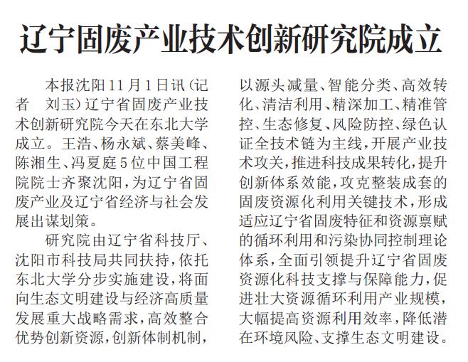 本报沈阳11月1日讯(记者 刘玉)辽宁省固废产业技术创新研究院今天在东北大学成立。王浩、杨永斌、蔡美峰、陈湘生、冯夏庭5位中国工程院院士齐聚沈阳,为辽宁省固废产业及辽宁省经济与社会发展出谋划策。