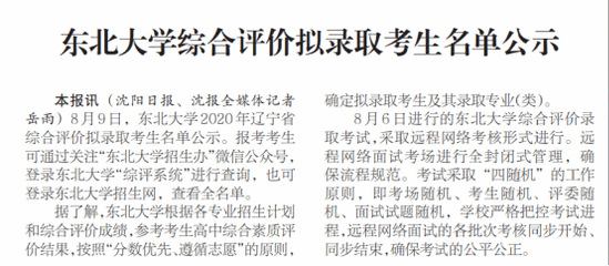 本报讯(沈阳日报、沈报全媒体记者岳雨)8月9日,东北大学2020年辽宁省综合评价拟录取考生名单公示。报考考生可通过关注“东北大学招生办”微信公众号,登录东北大学“综评系统”进行查询,也可登录东北大学招生网,查看全名单。