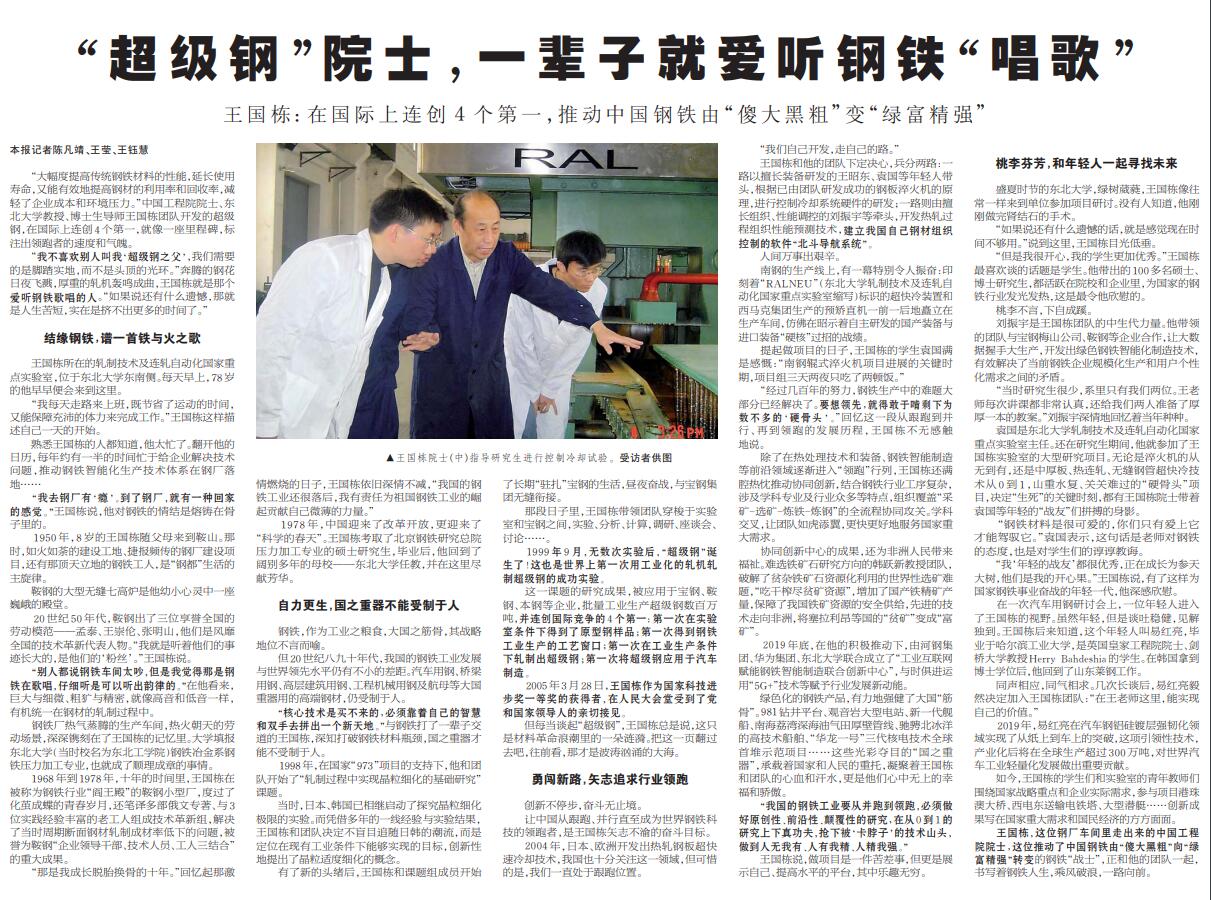 王国栋,这位钢厂车间里走出来的中国工程院院士,这位推动了中国钢铁由“傻大黑粗”向“绿富精强”转变的钢铁“战士”,正和他的团队一起,书写着钢铁人生,乘风破浪,一路向前。