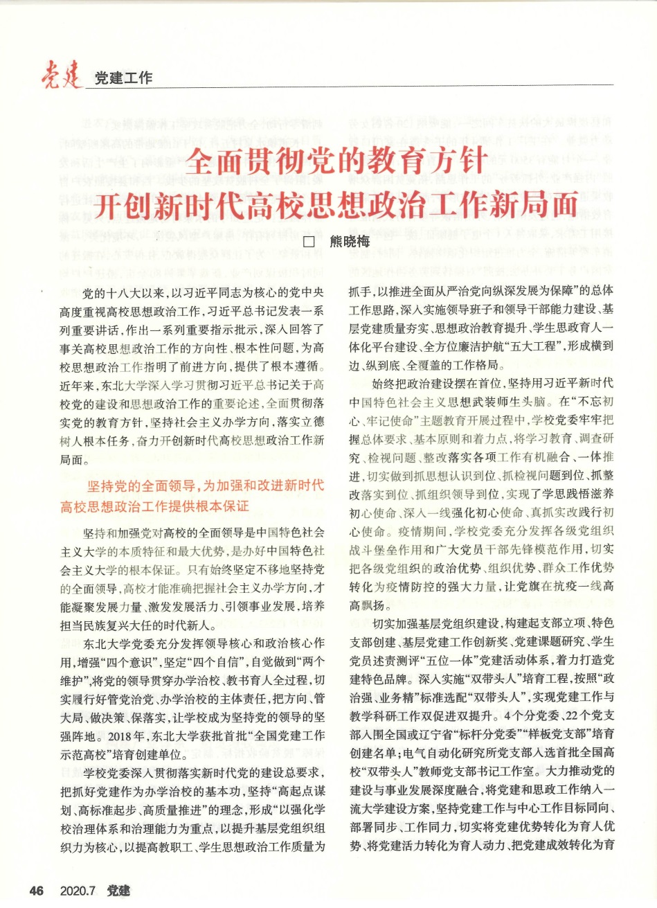 党的十八大以来,以习近平同志为核心的党中央高度重视高校思想政治工作,习近平总书记发表一系列重要讲话,作出一系列重要指示批示,深入回答了事关高校思想政治工作的方向性、根本性问题,为高校思想政治工作指明了前进方向,提供了根本遵循。近年来,东北大学深入学习贯彻习近平总书记关于高校党的建设和思想政治工作的重要论述,全面贯彻落实党的教育方针,坚持社会主义办学方向,落实立德树人根本任务,奋力开创新时代高校思想政治工作新局面。