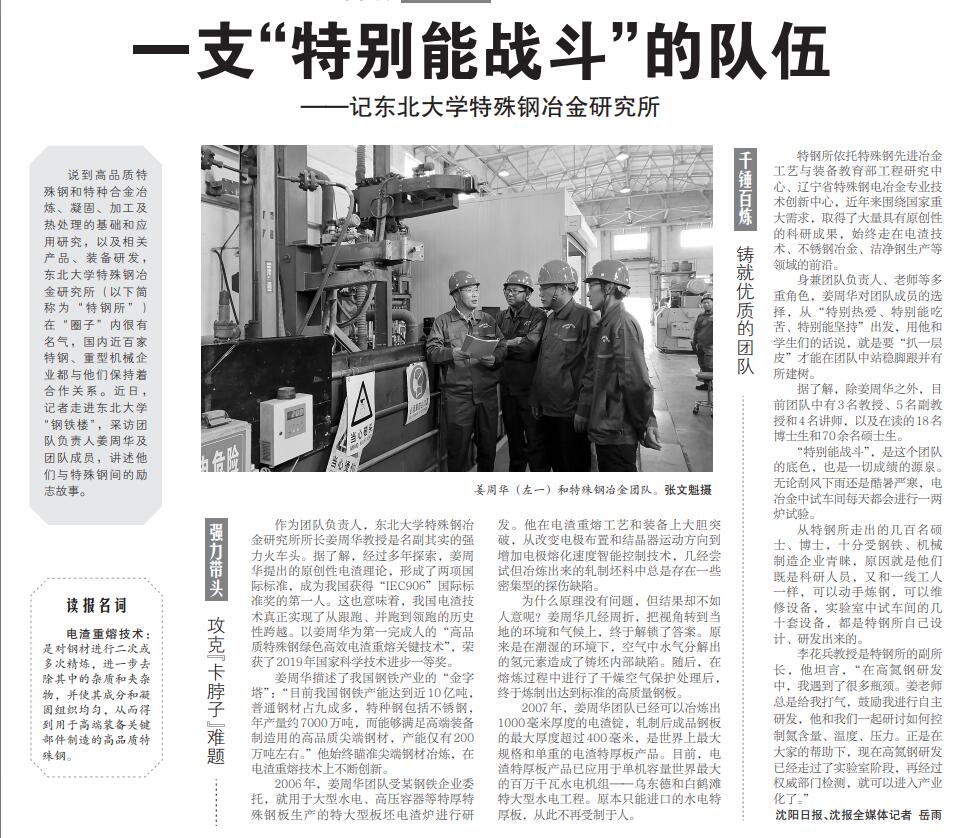 说到高品质特殊钢和特种合金冶炼、凝固、加工及热处理的基础和应用研究,以及相关产品、装备研发,东北大学特殊钢冶金研究所(以下简称为“特钢所”)在“圈子”内很有名气,国内近百家特钢、重型机械企业都与他们保持着合作关系。近日,记者走进东北大学“钢铁楼”,采访团队负责人姜周华及团队成员,讲述他们与特殊钢间的励志故事。