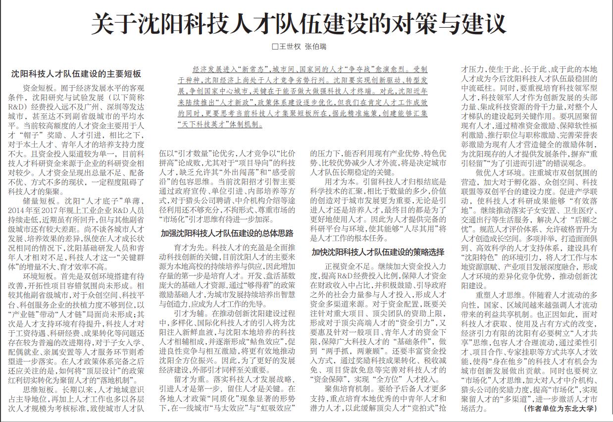 经济发展进入“新常态”,城市间、国家间的人才“争夺战”愈演愈烈。受制于种种,沈阳经济上尚处于人才竞争劣势行列。沈阳要实现创新驱动、转型发展,争创国家中心城市,关键在于能否做大做强科技人才终端。对此,沈阳近年来陆续推出“人才新政”,政策体系建设逐步优化,但我们在肯定人才工作成效的同时,更要思考当前科技人才集聚短板所在,据此精准施策,创建能够汇集“天下科技英才”体制机制。