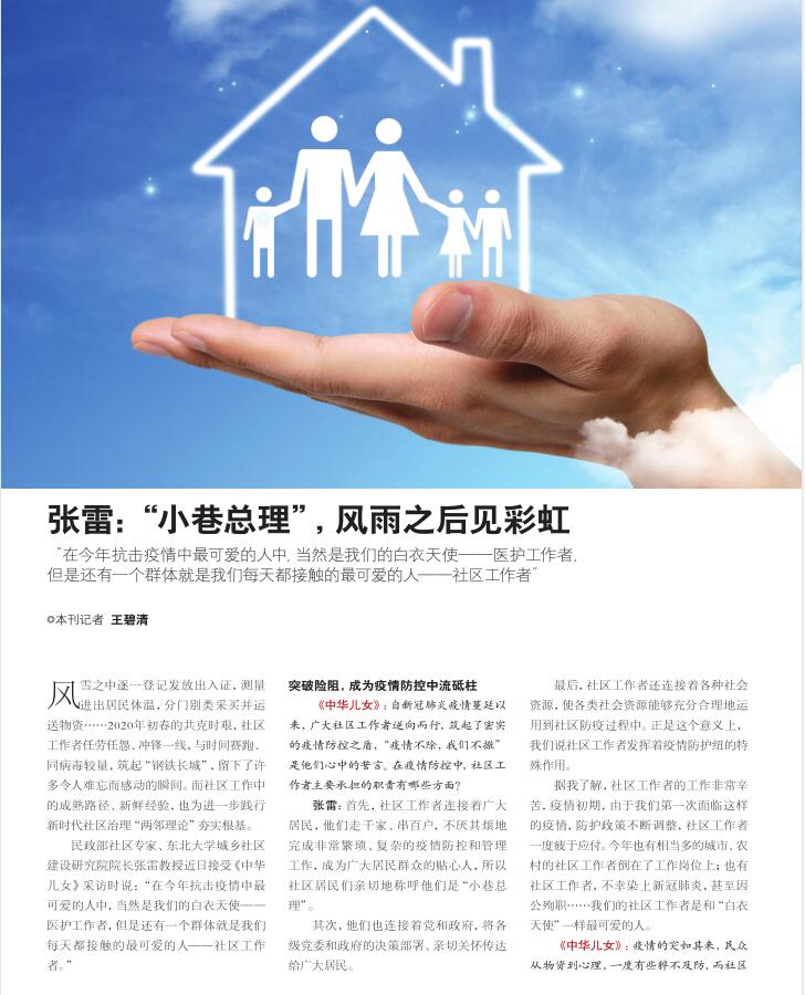 民政部社区专家、东北大学城乡社区建设研究院院长张雷教授近日接受《中华儿女》采访时说:“在今年抗击疫情中最可爱的人中,当然是我们的白衣天使——医护工作者,但是还有一个群体就是我们每天都接触的最可爱的人——社区工作者。”