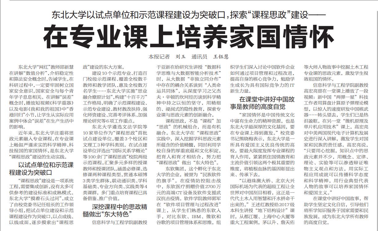 近年来,东北大学注重将思政元素融入专业课程,在专业课上畅叙严谨求实的科学精神、科技报国的家国情怀,是东北大学“课程思政”建设的生动实践。