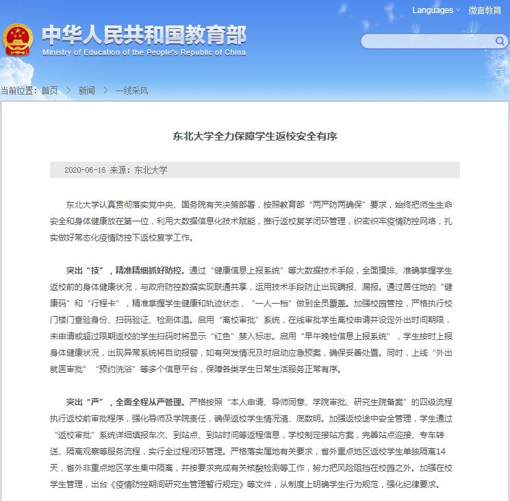 东北大学认真贯彻落实党中央、国务院有关决策部署,按照教育部“两严防两确保”要求,始终把师生生命安全和身体健康放在第一位,利用大数据信息化技术赋能,推行返校复学闭环管理,织密织牢疫情防控网络,扎实做好常态化疫情防控下返校复学工作。