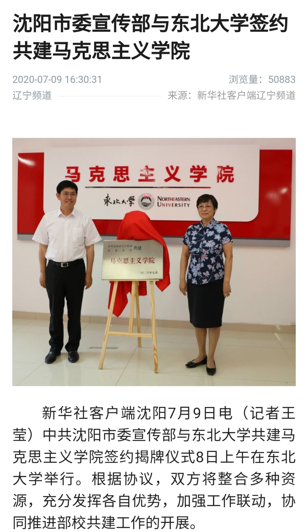 新华社客户端沈阳7月9日电(记者王莹)中共沈阳市委宣传部与东北大学共建马克思主义学院签约揭牌仪式8日上午在东北大学举行。根据协议,双方将整合多种资源,充分发挥各自优势,加强工作联动,协同推进部校共建工作的开展。