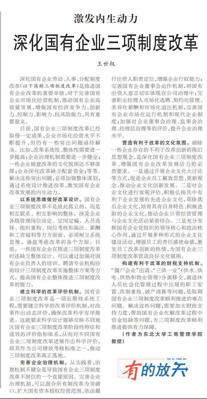 营造有利于改革的文化氛围。破除一些企业存在的不利于改革创新的陈旧思想观念,是深化国有企业三项制度改革、增强国有企业改革发展活力的必然要求。一是通过开展企业文化大讨论等方式,促进企业员工解放思想、更新观念,推动企业文化创新发展。二是对企业文化进行客观评估,积极弘扬其中有利于企业发展的先进企业文化,革除落后企业文化,培育具有自身特色、积极进取的企业文化,推动企业日常经营管理与企业文化活动紧密结合。三是充分发挥国有企业党组织的领导核心和政治核心作用,通过开展多种形式的企业文化建设活动,增强员工的责任感使命感,激发员工改革创新的热情,为国有企业三项制度改革营造良好文化氛围。