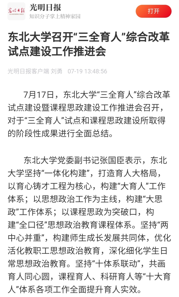 7月17日,东北大学“三全育人”综合改革试点建设暨课程思政建设工作推进会召开,对于“三全育人”试点和课程思政建设所取得的阶段性成果进行全面总结。