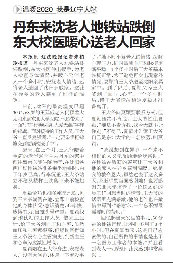 本报讯 辽沈晚报记者朱柏玲报道 丹东来沈老人地铁站楼梯跌倒,东大校医伸出援手,为老人检查身体情况,并暖心陪伴老人一个多小时,安抚老人情绪,还将老人送回了沈阳亲戚家。这让在异乡的老人感到了别样的温暖。