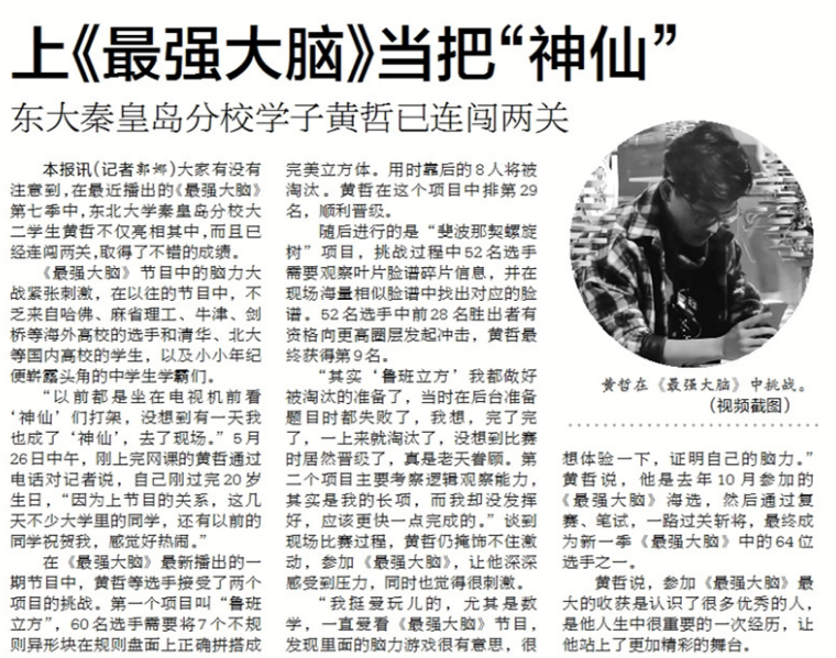 本报讯(记者郭娜)大家有没有注意到,在最近播出的《最强大脑》第七季中,东北大学秦皇岛分校大二学生黄哲不仅亮相其中,而且已经连闯两关,取得了不错的成绩。