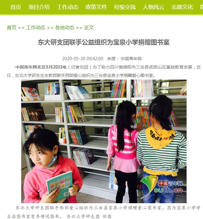 中国青年网北京5月20日电(记者刘喆)为了助力四川省绵阳市三台县贫困山区基础教育发展,近日,东北大学研究生支教团联手西部爱心组织为三台县宝泉小学捐赠爱心图书室。