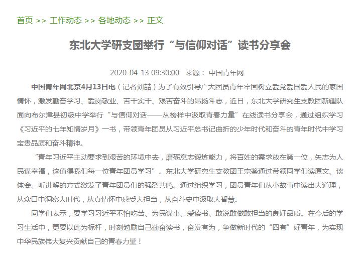 中国青年网北京4月13日电(记者刘喆)为了有效引导广大团员青年牢固树立爱党爱国爱人民的家国情怀,激发勤奋学习、爱岗敬业、苦干实干、艰苦奋斗的昂扬斗志,近日,东北大学研究生支教团新疆队面向布尔津县初级中学举行“与信仰对话——从榜样中汲取青春力量”在线读书分享会,通过组织学习《习近平的七年知青岁月》一书,带领青年团员从习近平总书记曲折的少年时代和奋斗的青年时代中学习宝贵品质和奋斗精神。
