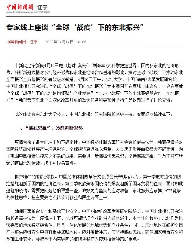 中新网辽宁新闻4月14日电 (赵球 高宏伟 刘海军)为科学把握世界、国内及东北的经济形势,分析新冠疫情对东北经济形势和东北亚经济合作进程的影响,探讨全球“战疫”下推动东北全面振兴全方位振兴的有效应对举措,4月10日下午,东北大学、中国(海南)改革发展研究院、中国东北振兴研究院以“全球‘战疫’下的东北振兴”为主题召开专家线上座谈会,与会专家就“全球‘战疫’下的东北结构调整与产业发展”“全球‘战疫’下的东北亚经贸合作与东北振兴”“新形势下东北全面深化改革开放的重大任务和突破性举措”等议题进行了讨论交流。