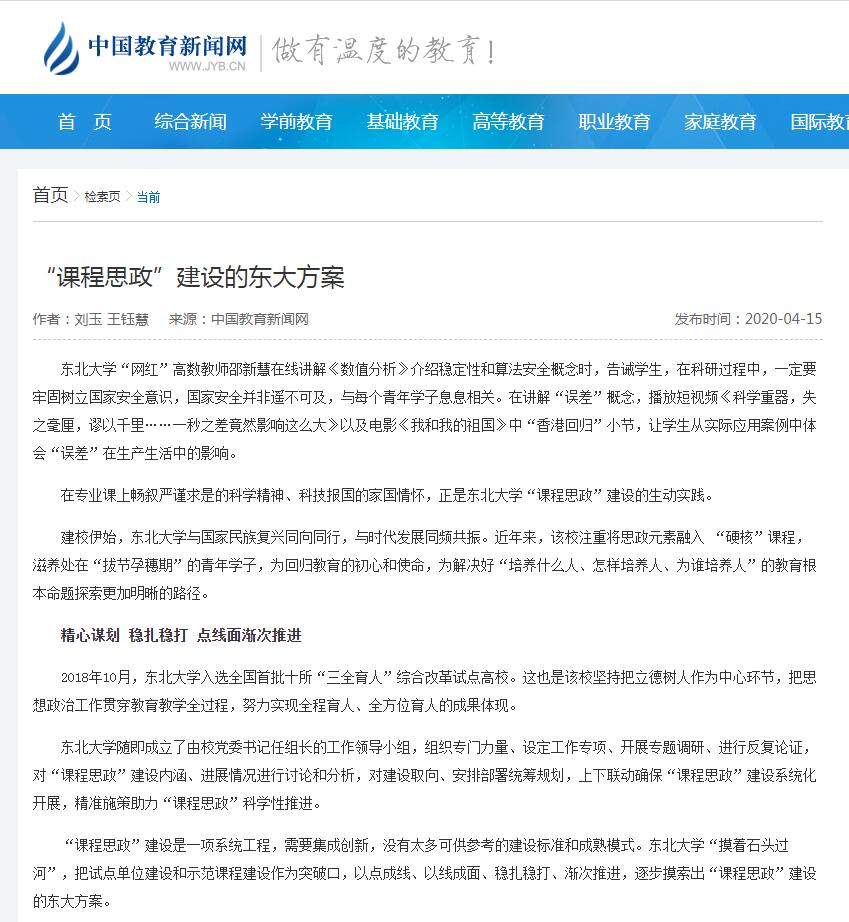 东北大学“网红”高数教师邵新慧在线讲解《数值分析》介绍稳定性和算法安全概念时,告诫学生,在科研过程中,一定要牢固树立国家安全意识,国家安全并非遥不可及,与每个青年学子息息相关。在讲解“误差”概念,播放短视频《科学重器,失之毫厘,谬以千里……一秒之差竟然影响这么大》以及电影《我和我的祖国》中“香港回归”小节,让学生从实际应用案例中体会“误差”在生产生活中的影响。