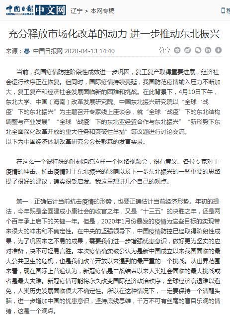 在这种情况下,我想今后改革工作可以讲四句话:一是坚持方向,就是坚持改革40年来,特别是十八届三中全会以来,中央确定的全面深化改革、全面依法治国,加快推进市场化改革这样的方向,这是坚持方向。二是放松管制。讲的还是政府和市场的关系,进一步厘清政府和市场的这种边界,能够按照这次9号文件要求的真正落实要素的自由流动和市场化配置,发挥市场在资源配置方面的决定性作用,政府对微观经济的干预要最小化,要最大限度的减少政府对资源配置、对微观主体的干预。全面落实公平竞争审查和市场准入负面清单。三是有效激励。有效激励实际上就是搞清和重启我们改革动力源。改革初期动力和激励机制非常清楚,逻辑关系也清楚,动力源也清楚。结合这次应对疫情要进一步的处理利益分配关系。比如说在整个国民收入分配方面,国家和整个社会的分配关系,首先一条就是要减税让利清费,让企业、让市场主体在大的危机下、大的灾难面前能够生存下来,长期可以健康发展。另外,要改变国有企业、民营企业在要素配置方面的一些不公平、不正当的做法,包括资金的配置方面,在这些方面要重点的预以解决。还要进一步调整中央地方关系,也是总结这次抗击疫情过程中出现的一些问题,地方正常的治理能力和快速反应是非常重要的,是要考虑将地方的权力、责任、义务结合起来,对公共危机能够快速有效地作出反应,中央集中决策成本还是比较高的。所以要强调有效激励,要提供各方面的激励措施。四是释放活力。释放活力不光释放市场主体的活力,地方的活力,各个要素的活力,包括市场的活力和社会的创造力,这方面都要有一系列的措施出台,通过这样的一些成套的、系统的体制机制方面的安排,来促进中国的经济社会发展在抗击疫情以后加快恢复,也为完善中国特色社会主义制度包括社会主义市场经济体制作出贡献!东北振兴也是在这个大背景下进行的。希望东北的同志既要考虑产业的振兴、东北亚的合作一体化,更要重视市场化的改革,落实好中央9号文件精神。向市场化改革要动力,向高水平对外开放要动力。要重树东北的形象:东北市场化改革的旗帜举的是最高的!法治建设和社会公平正义的环境是最好的!国际化对外开放的大门开得是最大的!做到这些,东北振兴就真的有希望了!