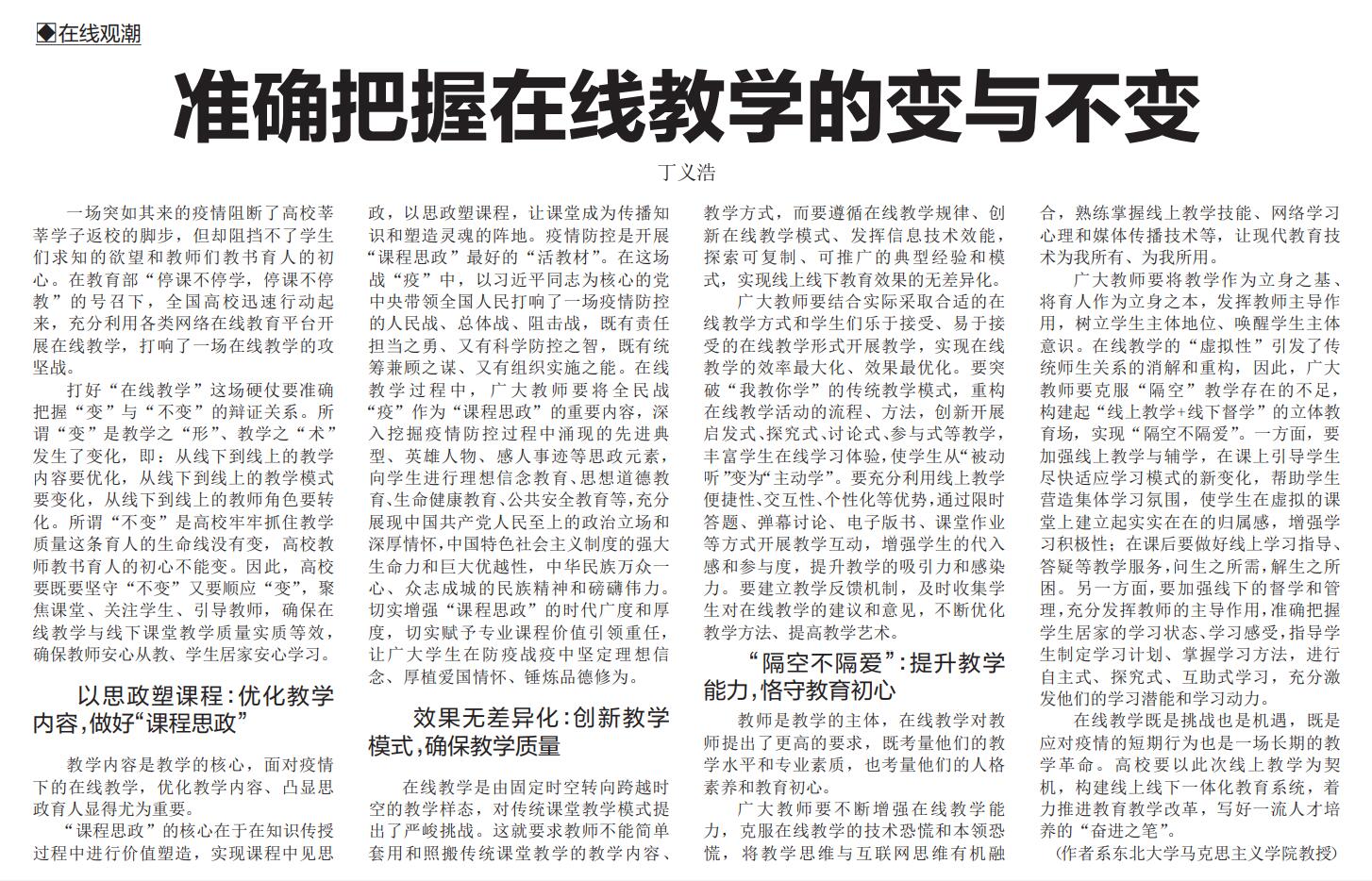 打好“在线教学”这场硬仗要准确把握“变”与“不变”的辩证关系。所谓“变”是教学之“形”、教学之“术”发生了变化,即:从线下到线上的教学内容要优化,从线下到线上的教学模式要变化,从线下到线上的教师角色要转化。所谓“不变”是高校牢牢抓住教学质量这条育人的生命线没有变,高校教师教书育人的初心不能变。因此,高校要既要坚守“不变”又要顺应“变”,聚焦课堂、关注学生、引导教师,确保在线教学与线下课堂教学质量实质等效,确保教师安心从教、学生居家安心学习。