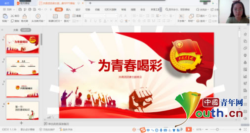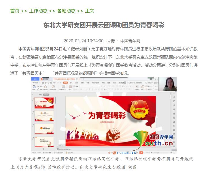中国青年网北京3月24日电(记者刘喆)为了更好地对青年团员进行思想政治及共青团的基本知识教育,在新疆维吾尔自治区布尔津县团委的统一组织安排下,东北大学研究生支教团新疆队面向布尔津高级中学、布尔津初级中学青年团员们开展线上《为青春喝彩》团学教育活动。活动分两讲,分别向团员们讲述了“共青团历史”、“共青团概况及组织原则”等相关团学知识。