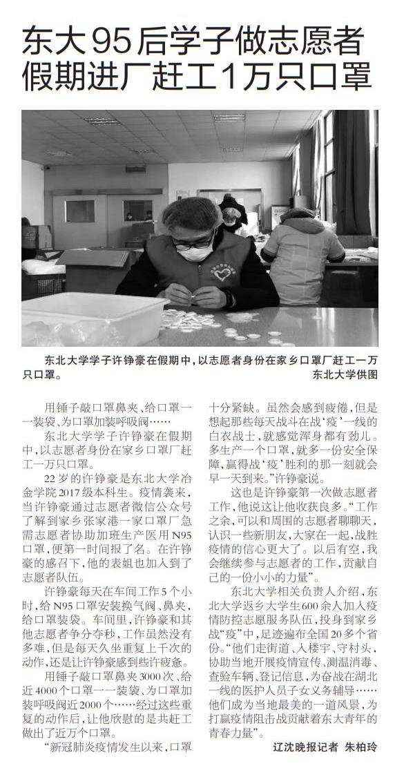 东北大学学子许铮豪在假期中,以志愿者身份在家乡口罩厂赶工一万只口罩。