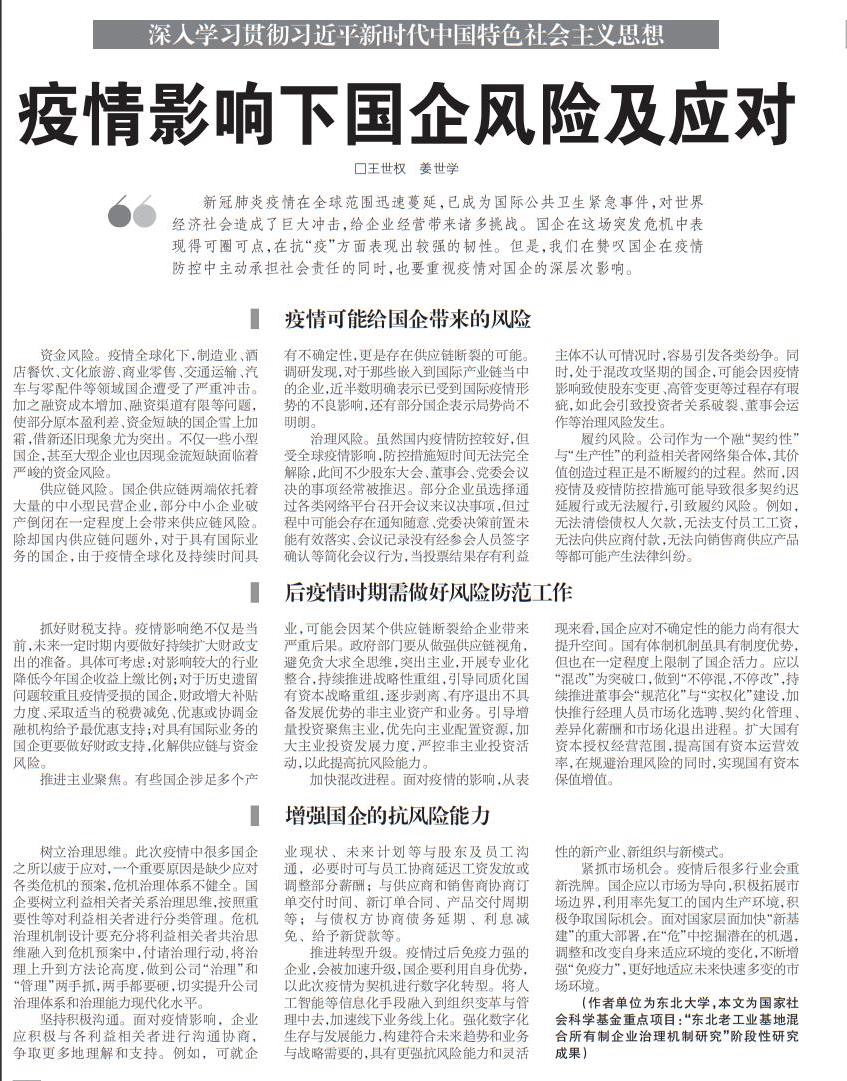 新冠肺炎疫情在全球范围迅速蔓延,已成为国际公共卫生紧急事件,对世界经济社会造成了巨大冲击,给企业经营带来诸多挑战。国企在这场突发危机中表现得可圈可点,在抗“疫”方面表现出较强的韧性。但是,我们在赞叹国企在疫情防控中主动承担社会责任的同时,也要重视疫情对国企的深层次影响。