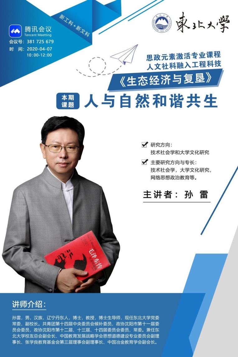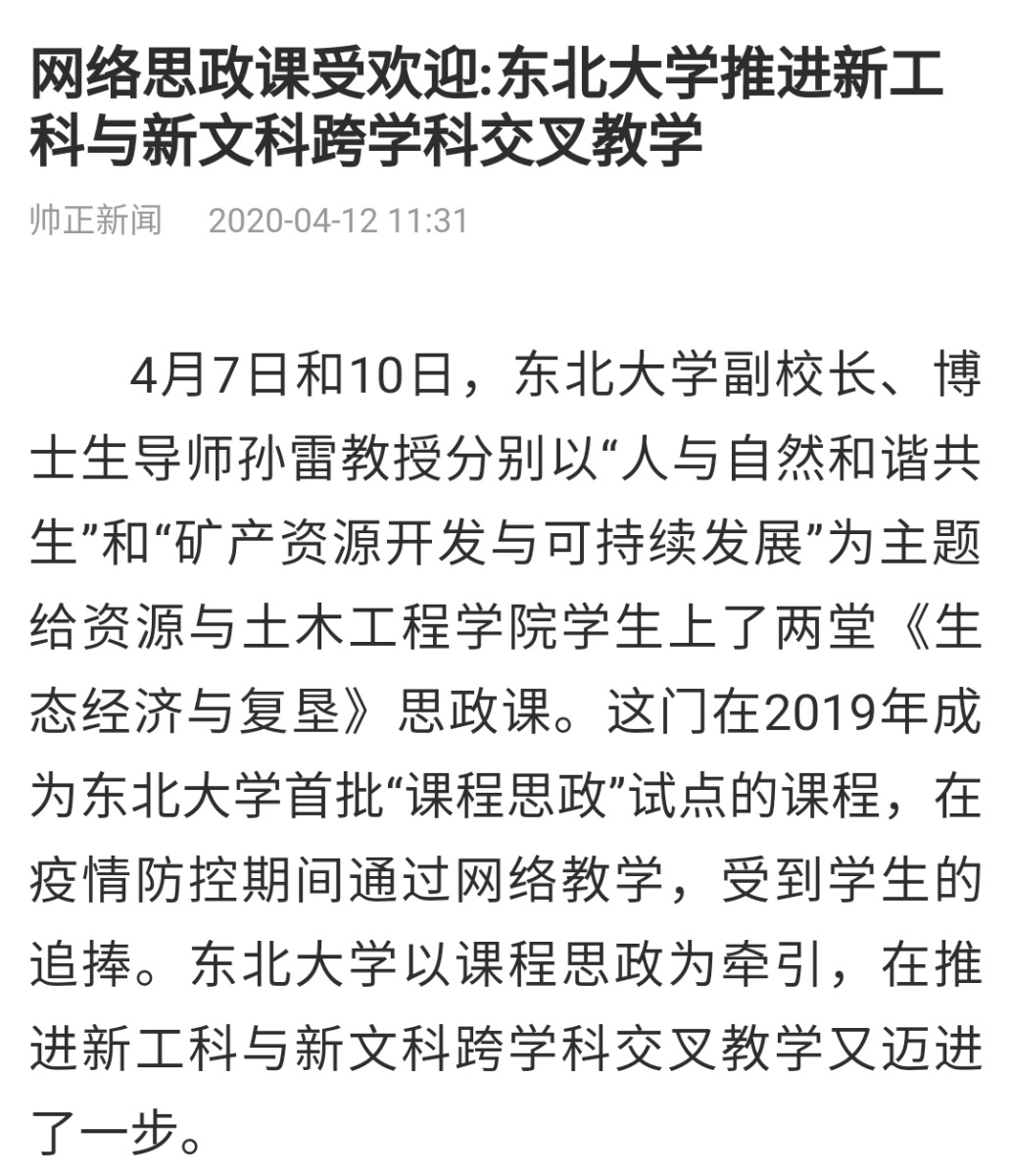 4月7日和10日,东北大学副校长、博士生导师孙雷教授分别以“人与自然和谐共生”和“矿产资源开发与可持续发展”为主题给资源与土木工程学院学生上了两堂《生态经济与复垦》思政课。这门在2019年成为东北大学首批“课程思政”试点的课程,在疫情防控期间通过网络教学,受到学生的追捧。东北大学以课程思政为牵引,在推进新工科与新文科跨学科交叉教学又迈进了一步。