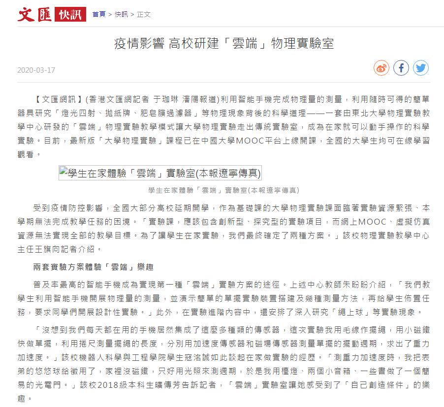 【文匯網訊】(香港文匯網記者 于珈琳 瀋陽報道)利用智能手機完成物理量的測量,利用隨時可得的簡單器具研究「燈光四射、拋紙牌、肥皂膜過濾器」等物理現象背後的科學道理——一套由東北大學物理實驗教學中心研發的「雲端」物理實驗教學模式讓大學物理實驗走出傳統實驗室,成為在家就可以動手操作的科學實驗。目前,最新版「大學物理實驗」課程已在中國大學MOOC平台上線開課,全國的大學生均可在線學習觀看。